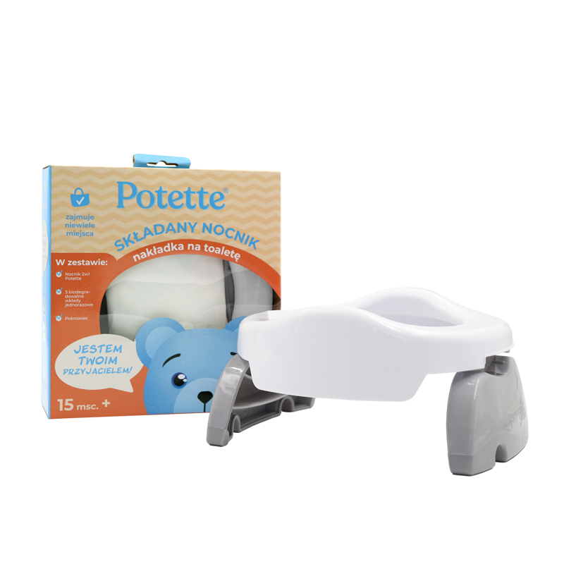 To wielokrotnie nagradzany produkt typu 2w1 – nocnik dla dziecka i jednocześnie nakładka na toaletę, która pasuje do każdego typu muszli.  Nocnik z jednorazowymi, pochłaniającymi ciecz i zapach wkładami może być używany jako higieniczny nocnik turystyczny. Po rozłożeniu nóżek na płasko zmienia się w bezpieczną nakładkę na toaletę. Po dokupieniu wielorazowego wkładu silikonowego sprawdzi się jako klasyczny nocnik. Dzięki zastosowanemu systemowi składania i blokowania nóżek, nocnik jest prosty i niekłopotliwy w użyciu. Antypoślizgowe wykończenie zapewnia dziecku stabilność, a wyprofilowane siedzisko wygodę podczas korzystania z Potette.
