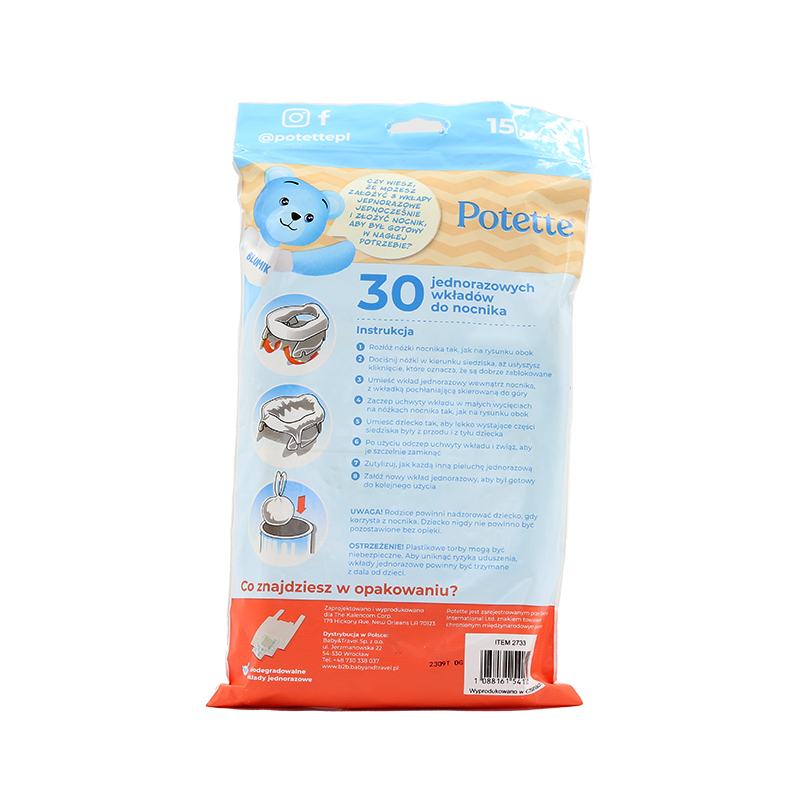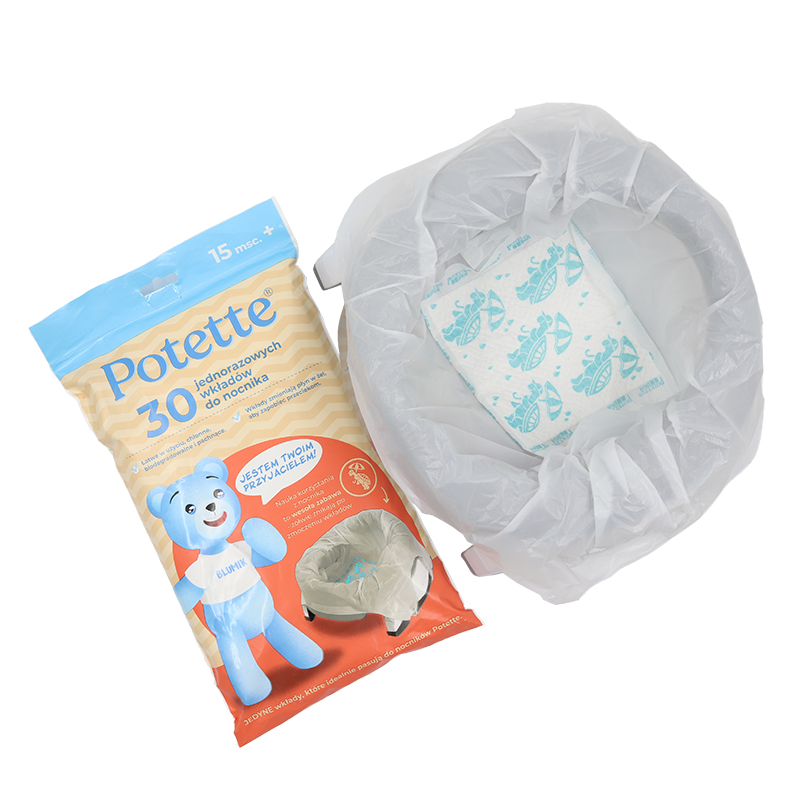 Wkłady jednorazowe przeznaczone do nocnika Potette. Są jednokrotnego użytku, zatem po wykorzystaniu wystarczy wyrzucić je do kosza. Przydadzą się zawsze wtedy, gdy zabierasz nocnik w podróż lub na spacer. Woreczki absorbują do 150 ml cieczy i doskonale pochłaniają nieprzyjemne zapachy. Dzięki temu pomagają utrzymać nocnik w czystości.